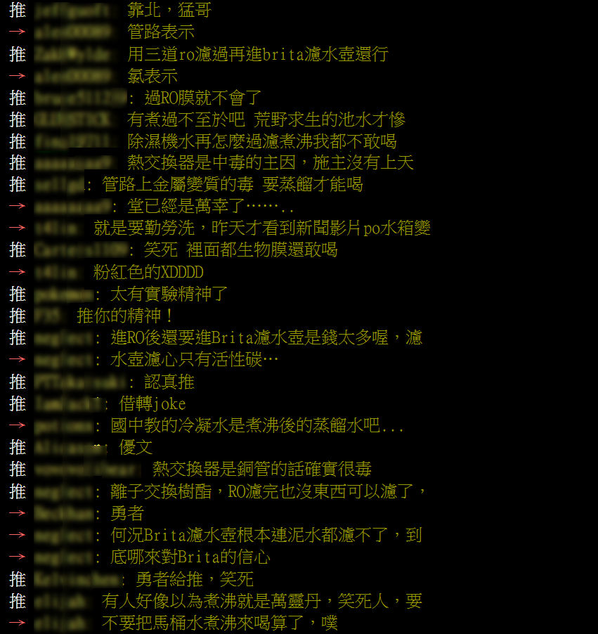 少數推文討論「如果先用RO逆滲透過濾再煮沸呢?」意見兩極。有人認為「過RO膜就不會了」,但也有人反駁,病毒和部分化學物質未必能被一般家用RO濾除乾淨。更有人吐槽:「RO濾完也沒東西可以濾了,你還要再過Brita 是錢太多嗎?」