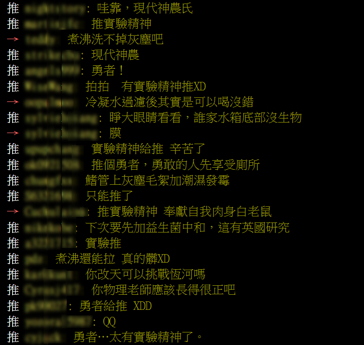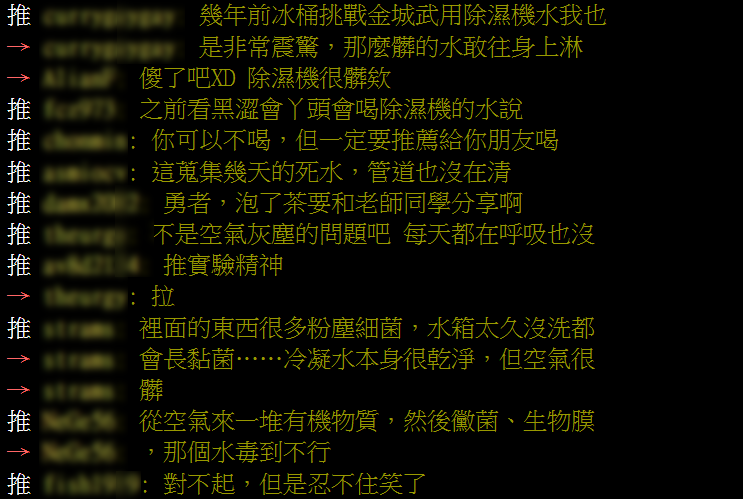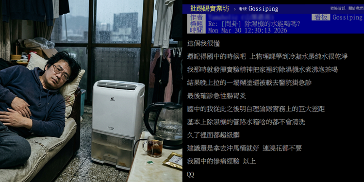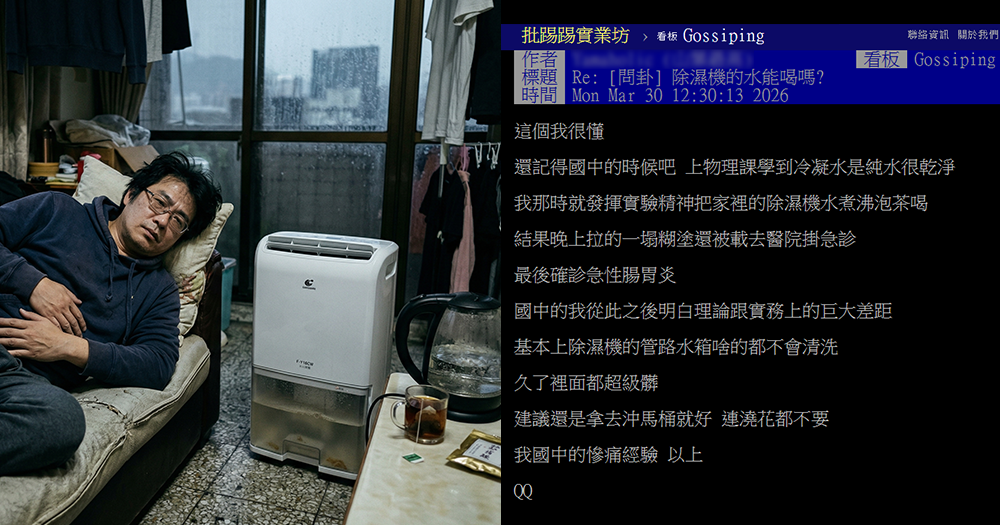 原PO在PTT八卦板回覆經典問題「除濕機的水能喝嗎?」,一開口就是血淚史。他回憶國中上物理課,老師教到冷凝水是純水、很乾淨,於是發揮「實驗精神」,把家裡除濕機收集的水倒出來煮沸,還拿來泡茶。