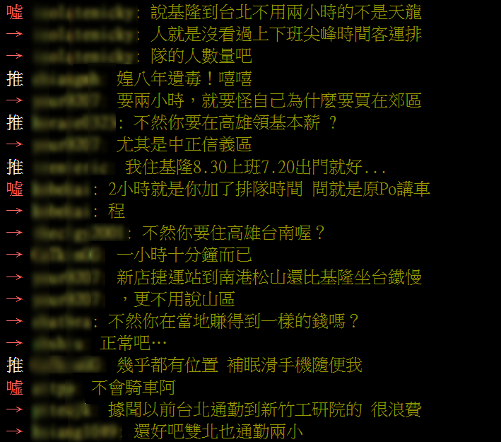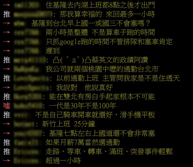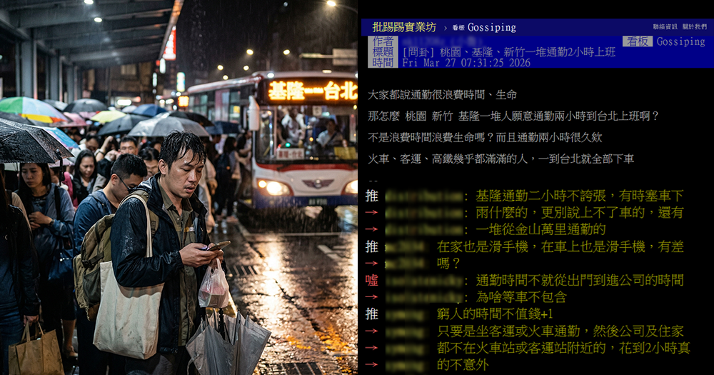 討論最後繞回了現實問題:「台北三房隨便4,500萬起跳」、「有錢誰不想住台北?」通勤不是選擇,對很多人來說是沒得選。但也有人看得開,「在家也是滑手機,在車上也是滑手機,有差嗎?」