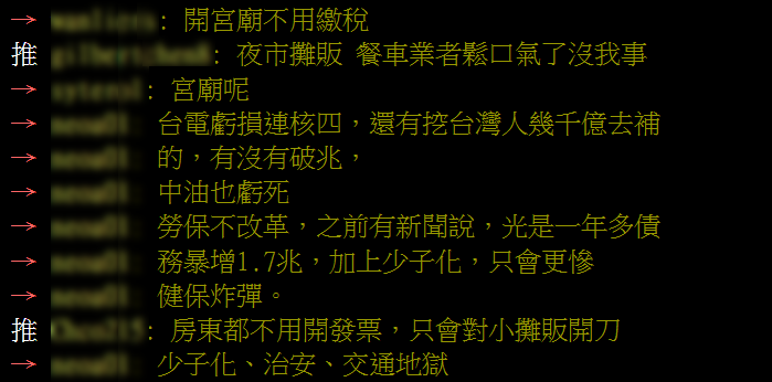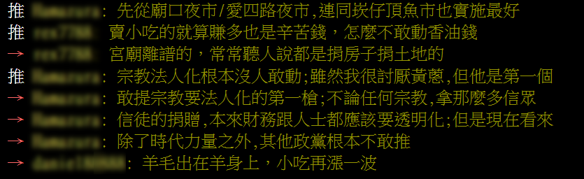 有網友直接點名:「先從廟口夜市、愛四路夜市,連同崁仔頂魚市也實施最好。」也有人感嘆:「賣小吃的就算賺多也是辛苦錢,怎麼不敢動香油錢?」、「宗教法人化根本沒人敢動。」矛頭指向宮廟財務長期不透明的老問題。
