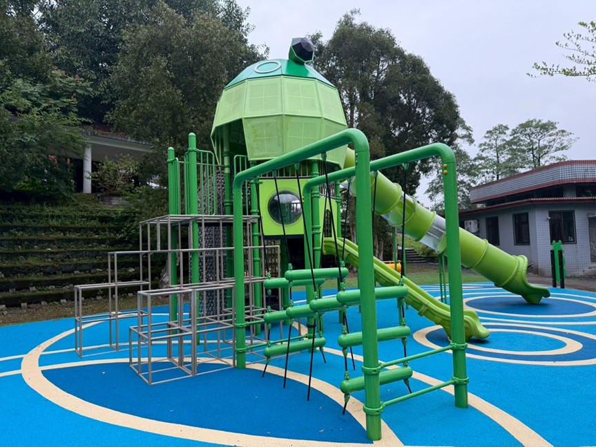 最吸睛的莫過於以赤蛙為造型的「高塔溜滑梯」,不僅外觀可愛,更結合了攀爬功能,讓孩子在挑戰自我的同時也能訓練體力。此外,場內還增設了鞦韆設施與彈跳床,透過多樣化的設施組合,滿足不同年齡層孩童的遊戲需求,提升動態互動的趣味性。