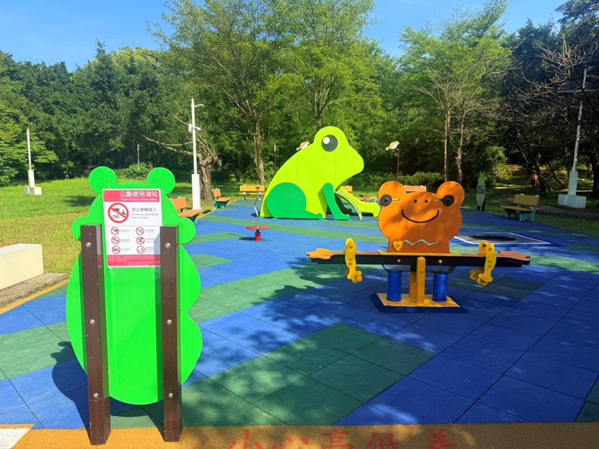 除了汰換老舊、具安全疑慮的遊具外,最特別的是融入了在地濕地生態元素(赤蛙、豆娘),且規劃過程中參考了在地里民與議員的意見,使其更符合在地家庭的使用習慣。
