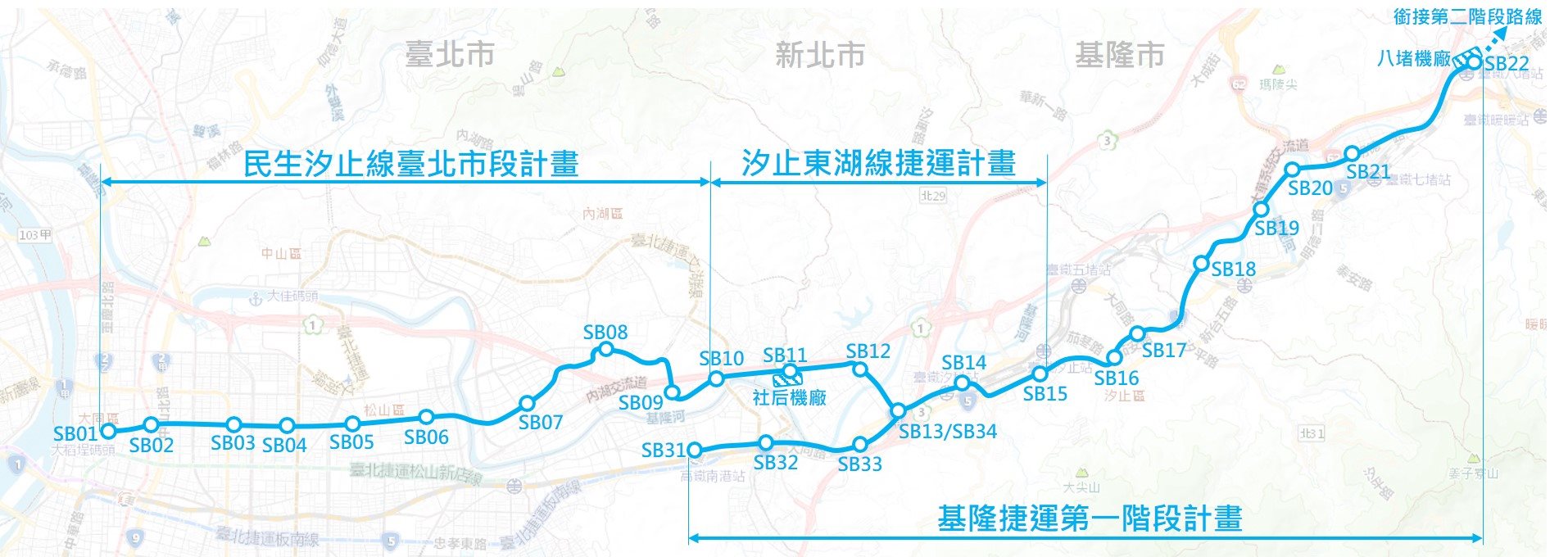 - 新北、台北段(8站):保長坑一、保長坑二、汐止區公所、汐科、樟樹灣、南陽大橋、南港展覽館、南港