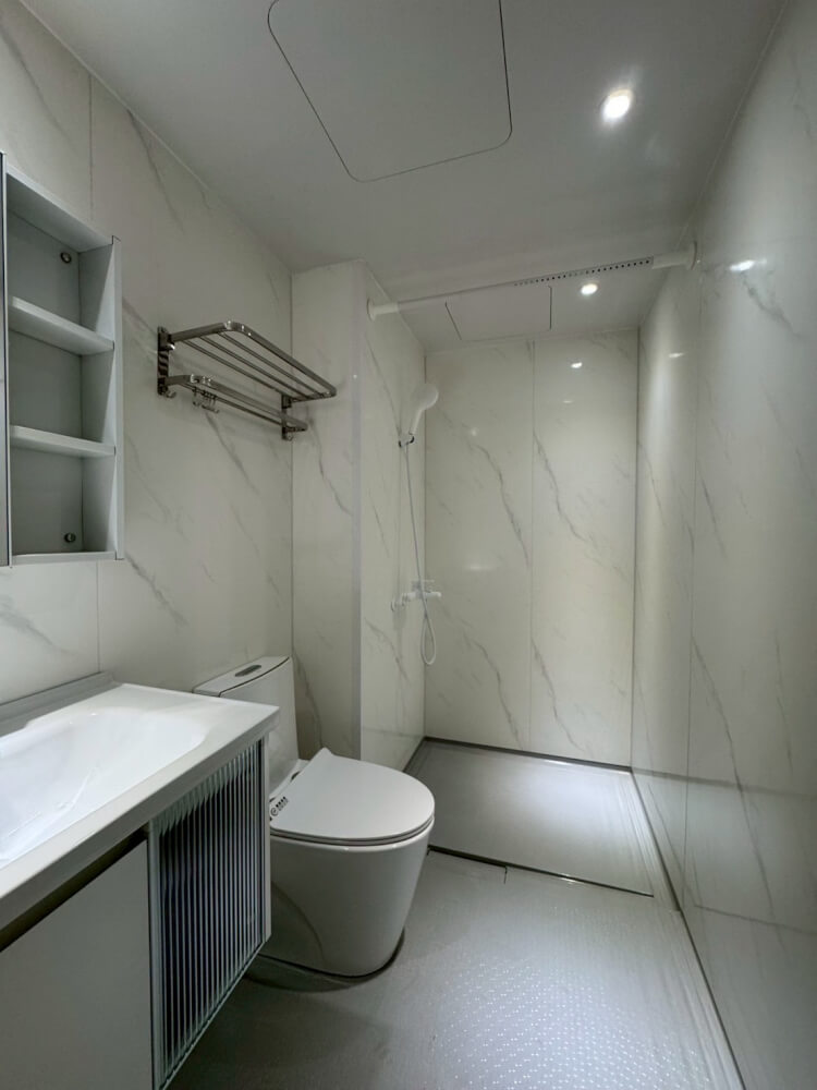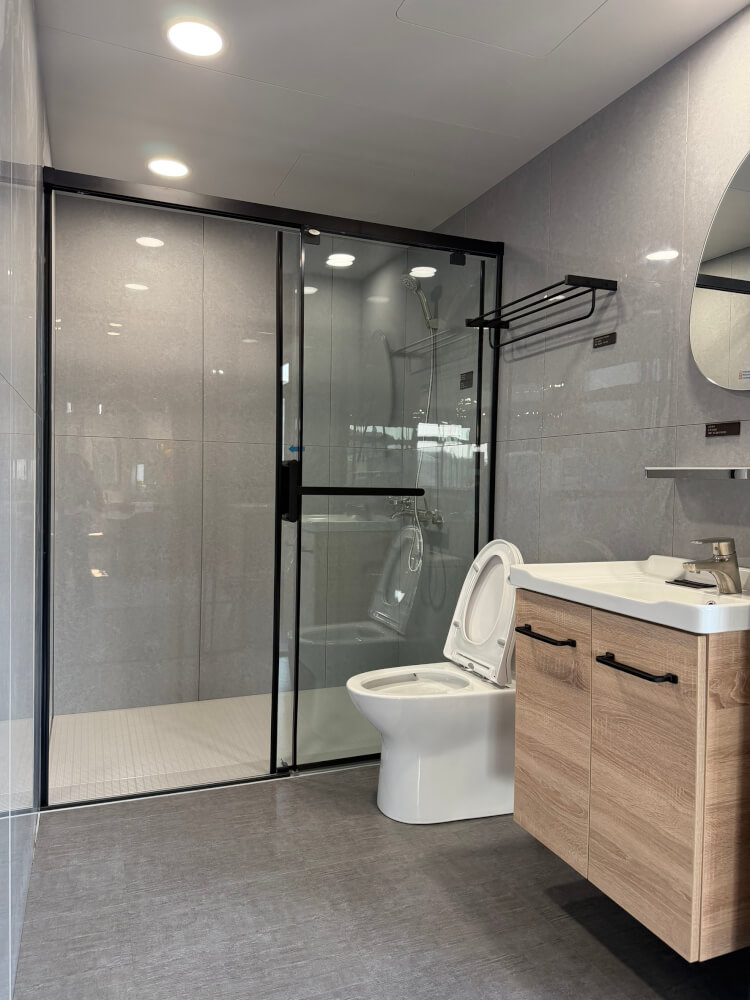 整體衛浴的底盤、牆板採無接縫或最少接縫設計,防水層是工廠預製而非現場手作,從結構上就大幅降低漏水機率。對建商來說,售後保固成本降低;對住戶來說,搬進去後不用再煩惱樓下鄰居來敲門。
