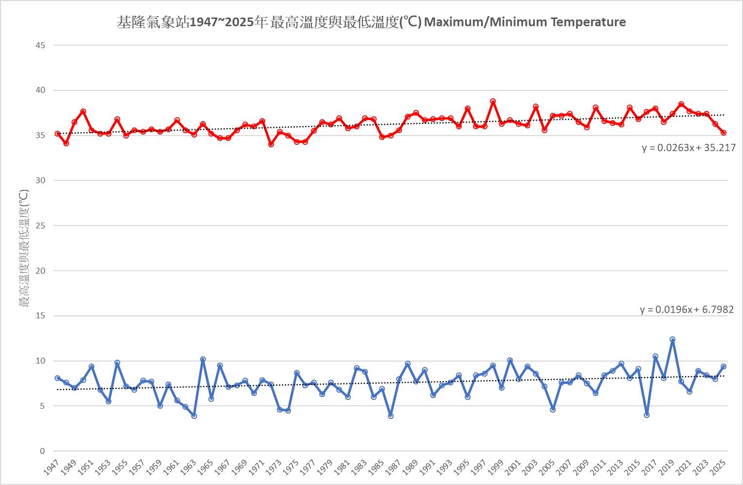 極端低溫事件則顯著減少,除了2016年「霸王寒流」測到4°C的低溫外,多數歷史低溫紀錄都集中在1990年以前。反觀高溫,近20年基隆幾乎年年出現36°C以上紀錄,歷史前五名的最高溫紀錄都集中在近30年內。