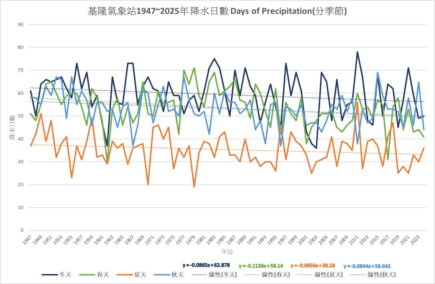 若依季節拆解,變化最劇烈的是春天。氣象站以百年趨勢計算,春季雨日減少11天(減幅19%),夏季減少6天(15.8%),秋季減少8天(14%),冬季減少8天(12.7%)。儘管目前基隆年雨日仍維持在200天左右,但儘管目前基隆年雨日仍維持在200天左右,但「雨季縮減」已成不爭的事實。。