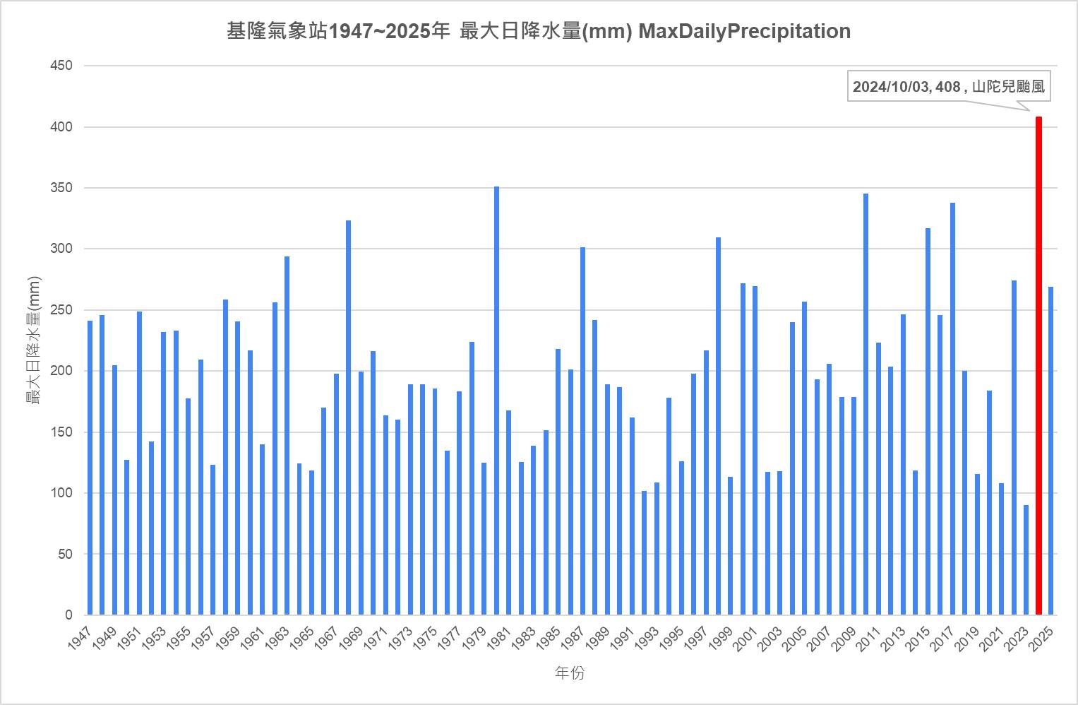 氣象站數據顯示,近年極端降雨紀錄頻繁被刷新。2024年10月3日颱風山陀兒侵台期間,基隆測站測到單日408毫米的驚人雨量,打破氣象站設站78年以來的最高紀錄,超越1980年熱帶性低氣壓創下的351.3毫米。
