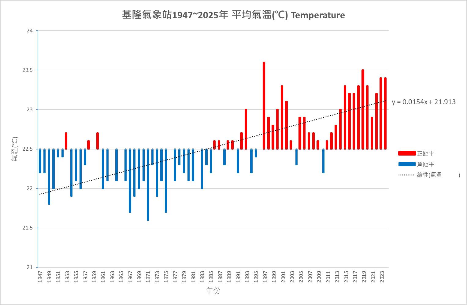 與降雨變化同時發生的,是基隆的穩定暖化趨勢。氣象站資料顯示,基隆年平均氣溫的氣候平均值為22.5°C,每10年增加0.15°C,過去10年之中有9年的年均溫達到23°C以上,遠高於長期平均值。