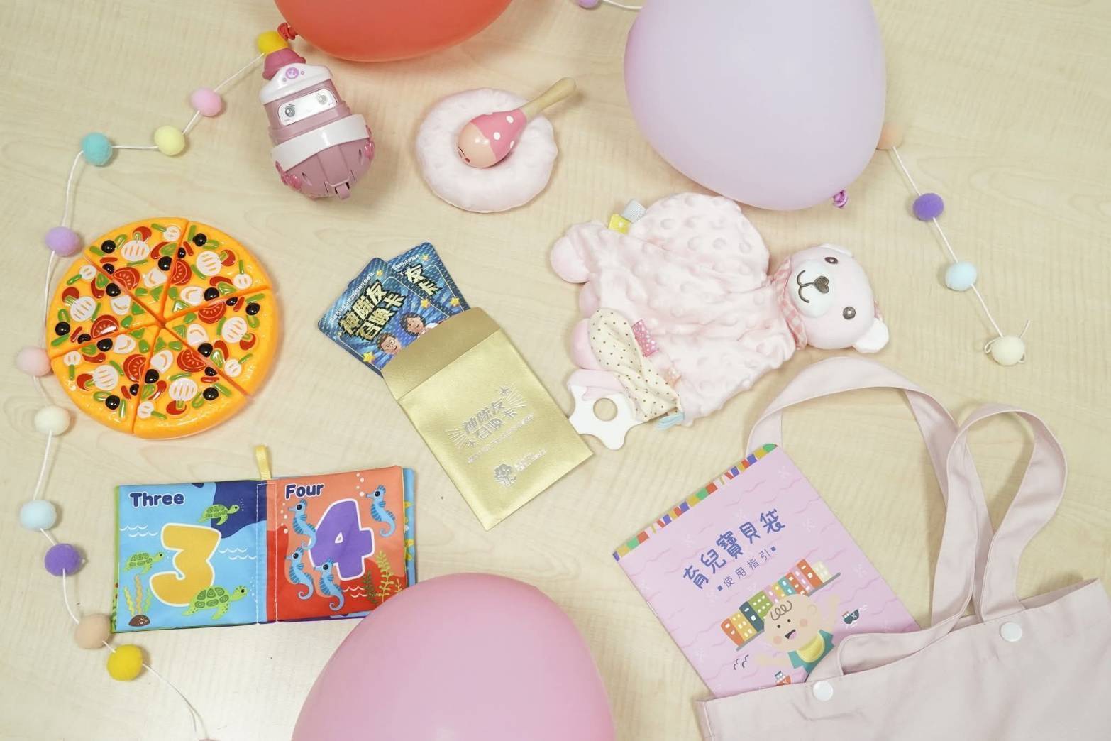 除了召喚卡,辦理出生登記時家長還會拿到「育兒寶貝袋2.0」。袋內除了安撫娃娃和組合玩具,原本的玩具車這次改為「迴力船」,呼應基隆的海洋城市印象。