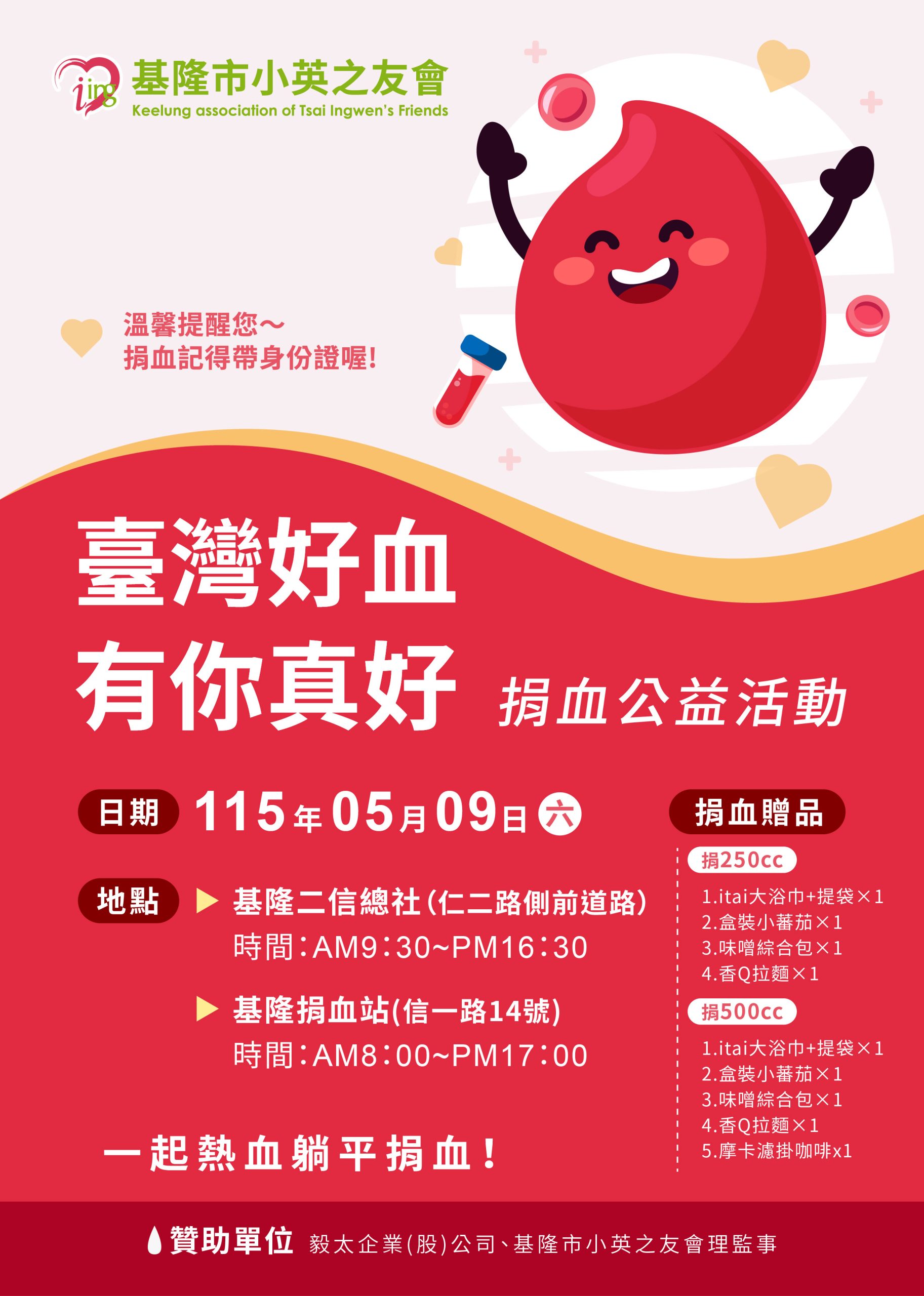 你有多久沒捐血了?下週六(5/9)就是母親節前一天,毅太企業股份有限公司攜手基隆市小英之友會,在基隆二信總社及基隆捐血站雙場同步舉辦「臺灣好血,有你真好」捐血公益活動。成功捐血就送 ITAI 純棉大浴巾+提袋,再加碼盒裝小番茄、味噌綜合包、香 Q 拉麵等多項好禮,數量有限送完為止。